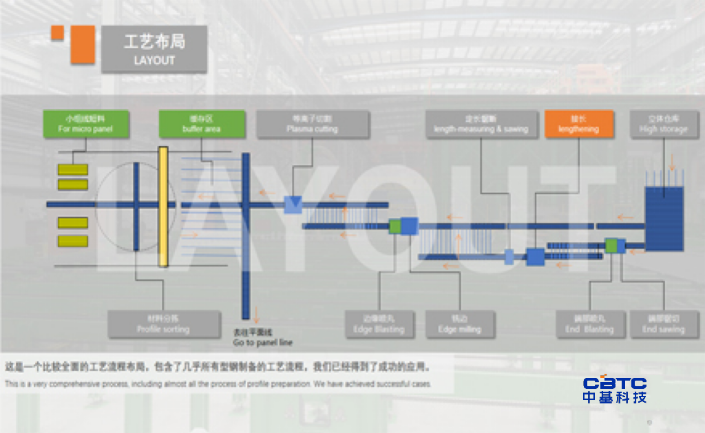 工艺布局取决于车间环境、产品范围、自动化程度、生产效率等几个方面。我们已经有十余条产线的经验,有涵盖型钢制备全套的工艺的全功能布局方案,有针对狭窄空间的穿梭式布局放,也有针对开阔场地的高效流转布局方案;