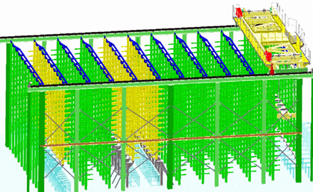 托盘式立体库存储的零件包含切边完的甲板板、围壁板、T型材腹板、肘板、补板等零件,所有零件以托盘为单位储存在立体库。分拣、集配完成的托盘由配备集装箱吊具的行车吊运到立体库入货口输送系统,入库输送系统和码垛机按照WMS的指令将托盘运送到货架指定仓位;托盘出库时,WMS根据出货清单,控制出库输送系统和码垛机将目标托盘取出,交由车间AGV运送到目标工位。