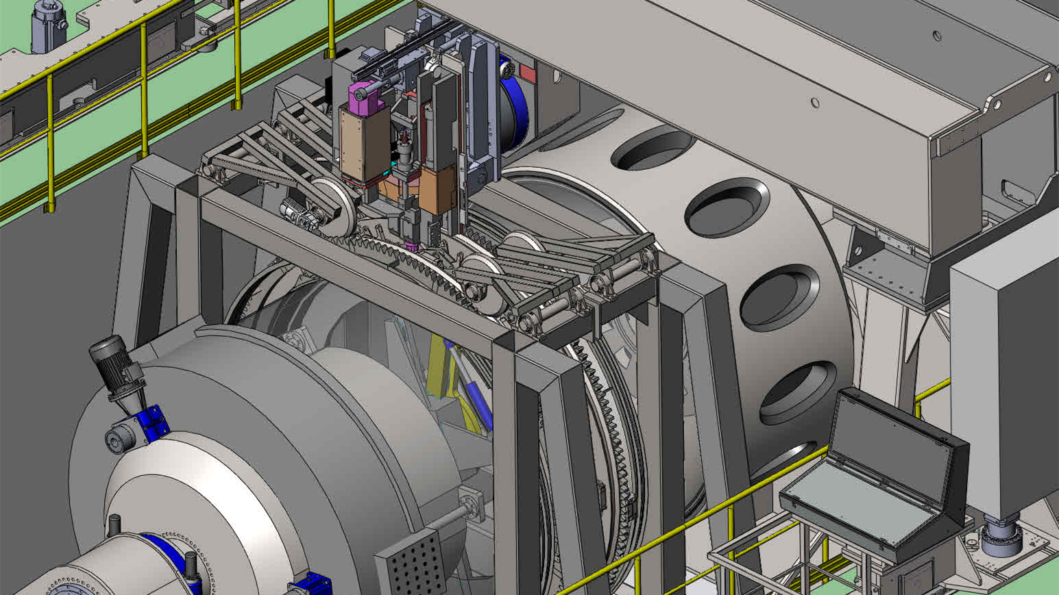 运载火箭燃料贮箱筒段的环缝对接以搅拌摩擦焊工艺为主,采用大型龙门结构配合对应的工装完成焊接动作。设备根据焊接对象的尺寸定制,最大筒段直径可达10m,筒体壁厚可达25mm。系统采用CNC控制,支持“恒压力-恒位置”的控制模式,精确控制焊缝质量。设备可根据不同的需求,选择机械主轴和电主轴驱动,在环缝焊接种可以选用可回抽主轴,消除焊接尾孔。为提高焊缝组队精度,可选择配置铣削机头,可对工件焊缝边缘进行铣边作业。根据产品的特性提供的定制化的的内撑外压工装。
