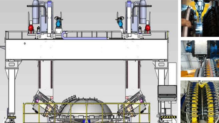 运载火箭燃料贮箱的封头为椭球体半球形状,制作工艺通常采用预压制成型的“瓜瓣”逐一拼焊而成,为了确保“瓜瓣”拼焊的尺寸精度,中基科技提供了一套5轴联动的龙门搅拌摩擦焊加自动铣边装置配合完成。预留余量的“瓜瓣”被安装在椭球体胎膜上,通过安装在高精度定位转台上的内撑外压工装固定,5轴联动的铣削装置完成待对接瓜瓣边缘余量的铣削,高精度的CNC系统有效保证了“瓜瓣”的圆周长尺寸精度。铣削后,胎膜工装自动的将“瓜瓣”压紧到焊接位,精密的控制在强大的工艺数据库支持下,能够确保“零间隙”的拼合。就绪后5轴联动的搅拌摩擦焊沿着母线方向完成焊缝的焊接。系统支持“恒压力-恒位置”的控制模式,精确控制焊缝质量,最大的焊接厚度可达25mm以上。