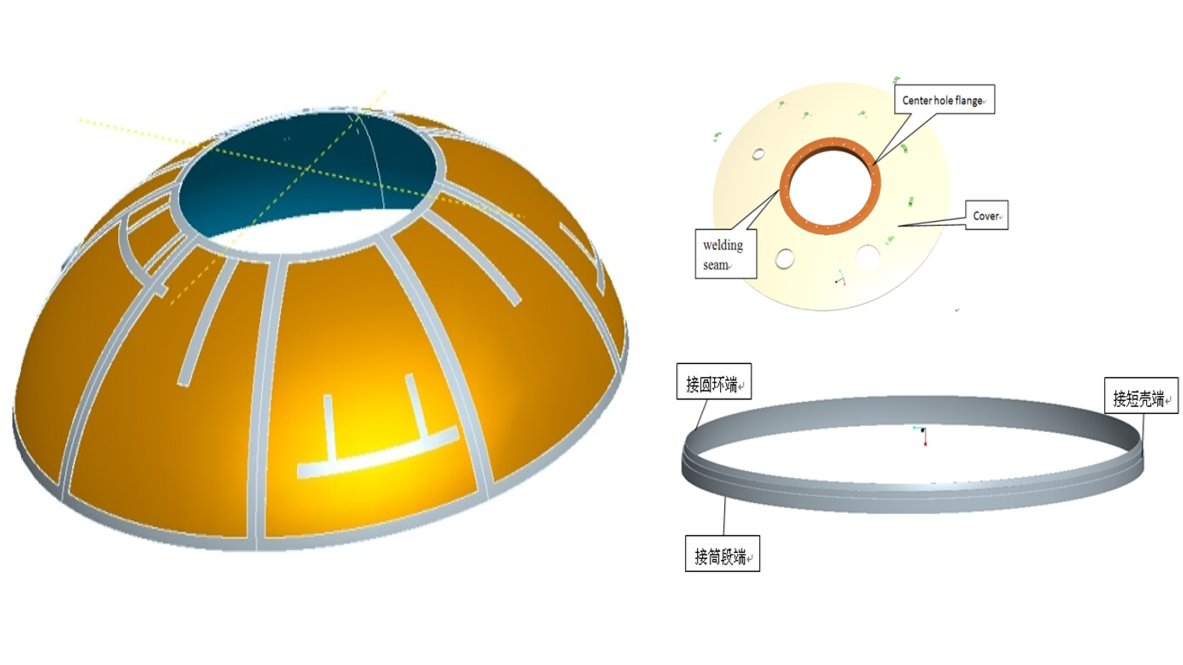 封头环形焊缝解决方案运载火箭燃料贮箱的封头的人孔法兰、叉形环等附件与封头“瓜瓣”的连接为环形焊缝。通过胎膜固定工件,利用5轴联动的铣削机头和5轴搅拌摩擦焊机头完成焊接,并选用可回抽主轴,以消除焊接尾孔,这是环缝的关键。